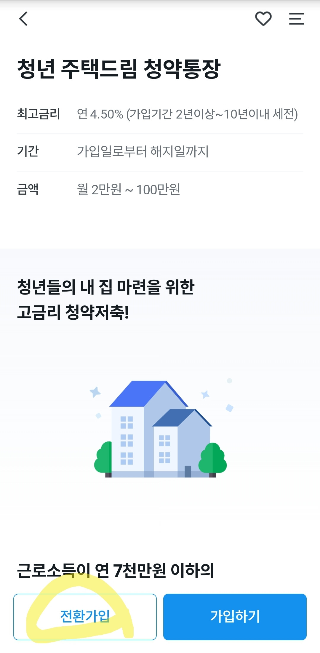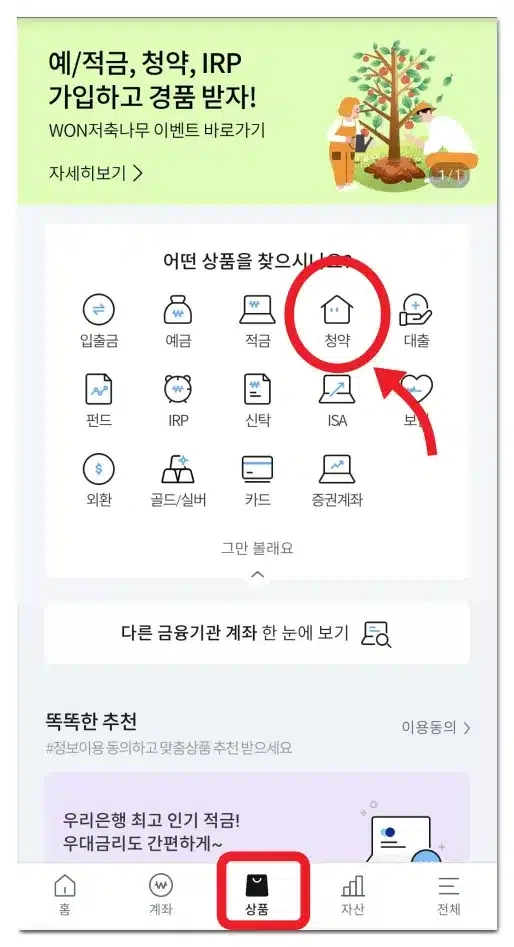 🔹 앱을 실행하면 다양한 금융 상품을 확인할 수 있습니다. 청약 통장 가입을 위해 '청약' 아이콘을 선택합니다.